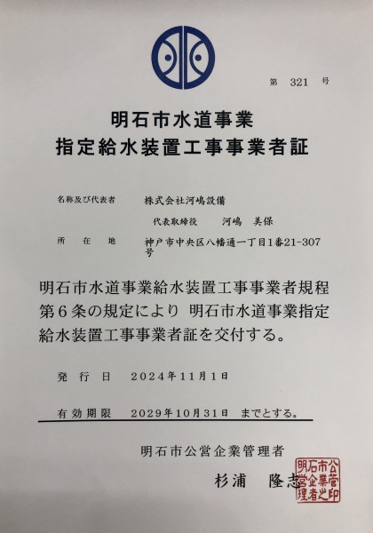 この度、明石市の給水設備指定工事店の認定を受けることができました。これからも精進してまいります。