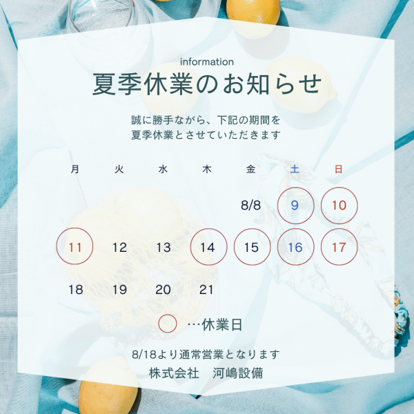弊社では、誠に勝手ながら下記日程を夏季休業とさせていただきます。